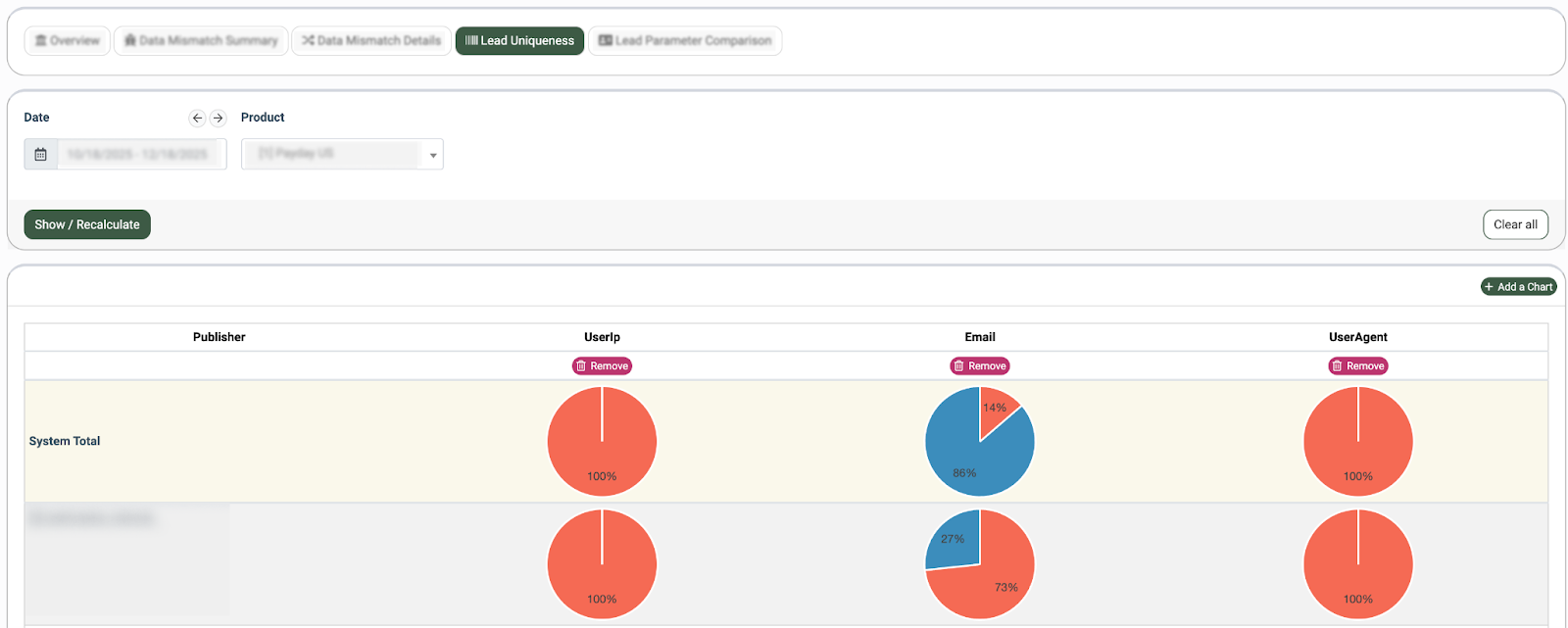 The Lead Uniqueness tab allows you to check a percentage ratio of unique leads for each Publisher based on specific parameters defined by the Product, represented through pie charts.