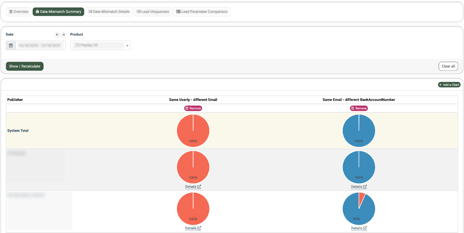 The Data Mismatch Summary tab allows you to view a percentage ratio for selected parameters. It includes a table with pie charts in each cell, highlighting cases where lead data is inconsistent, such as the same User IP with different email addresses, the same email with different bank account numbers, and so on.