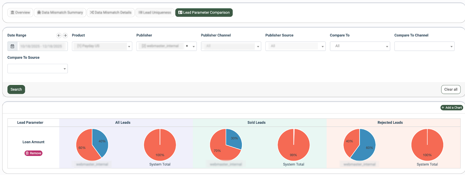 The Lead Parameter Comparison report displays the distribution of lead parameter values for a selected publisher compared with the system total or another publisher for a chosen lead parameter, segmented by all leads, sold leads, and rejected leads. For example, if the selected lead parameter is Bank Account Type, the row represents that parameter, while the pie charts show how individual values (such as Checking or Savings) are distributed within each segment. This view helps admins quickly identify abnormal value distributions or inconsistencies between publisher traffic and overall system behavior, supporting lead quality validation and fraud analysis.