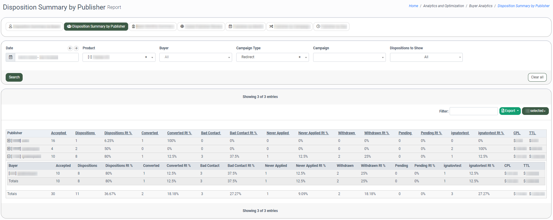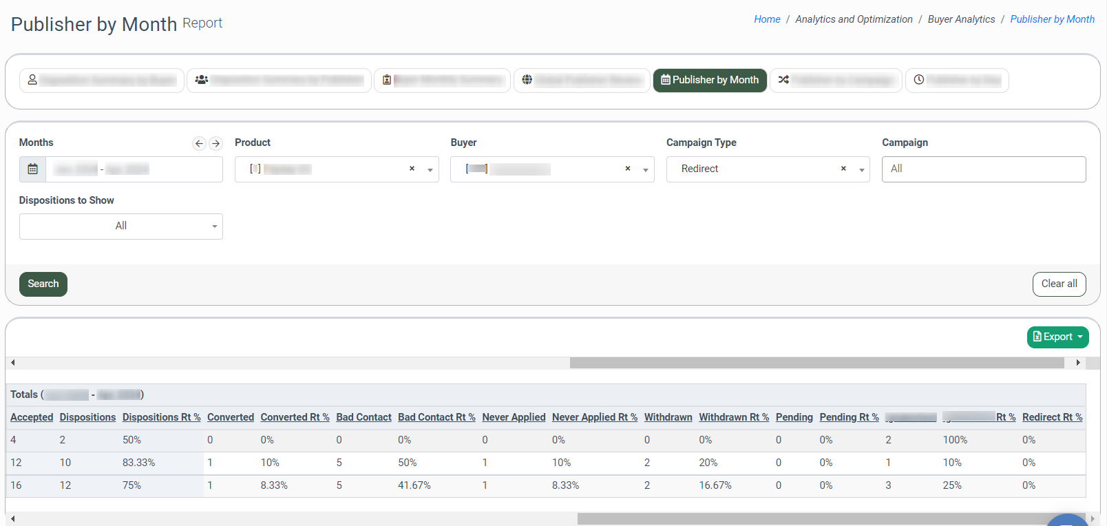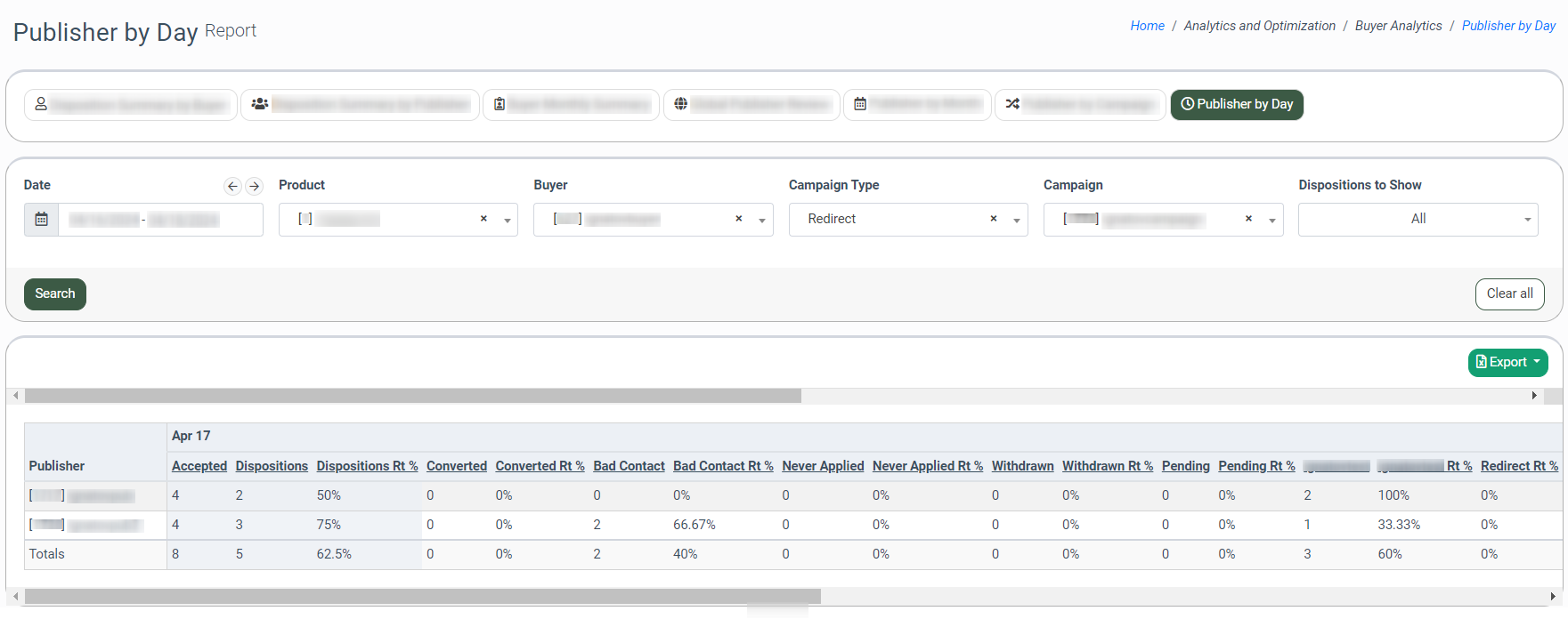 The Disposition Summary by Buyer tab allows you to view a summary report about each Buyer's accepted lead flow, such as the number of leads accepted by the Buyer(s), by what Publisher(s) the flow was generated, and how many of those leads have each of the disposition statuses. Note: This report has a date range restriction of up to three months, but the system adds an extra month to a starting date.