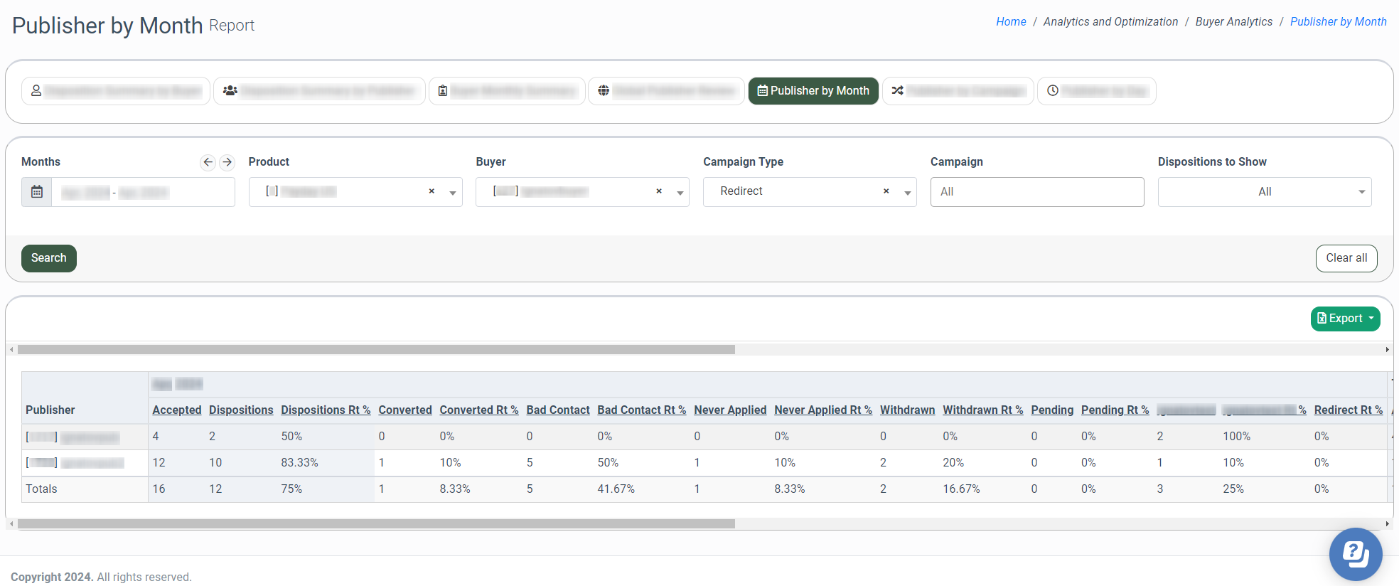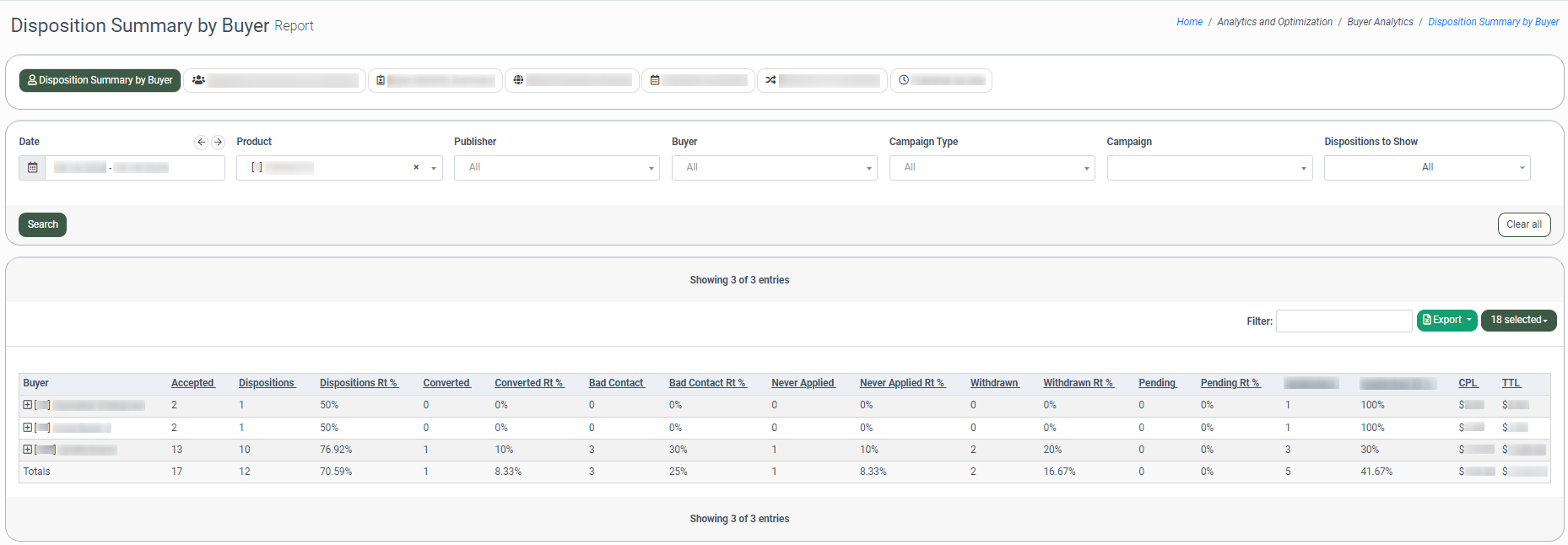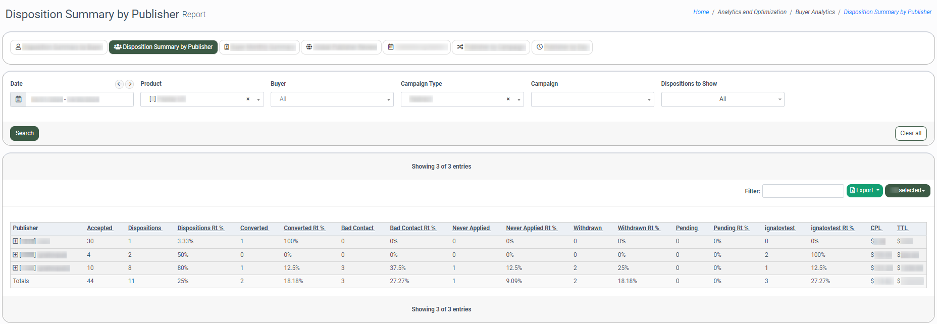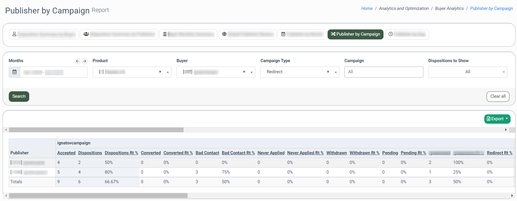 The Disposition Summary by Buyer tab allows you to view a summary report about each Buyer's accepted lead flow, such as the number of leads accepted by the Buyer(s), by what Publisher(s) the flow was generated, and how many of those leads have each of the disposition statuses. Note: This report has a date range restriction of up to three months, but the system adds an extra month to a starting date.