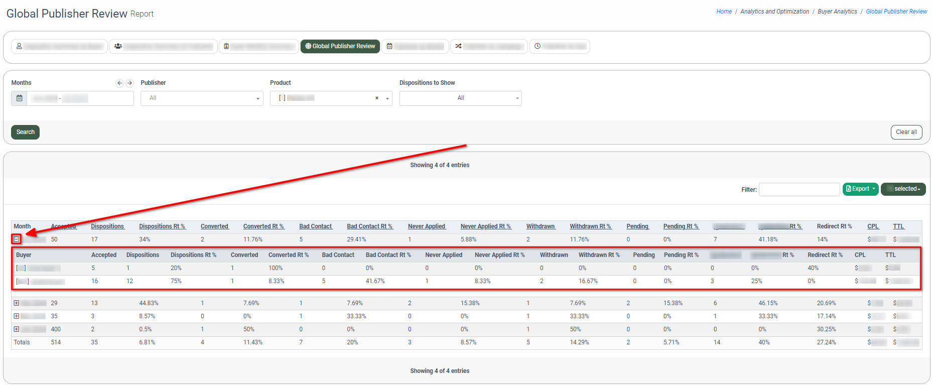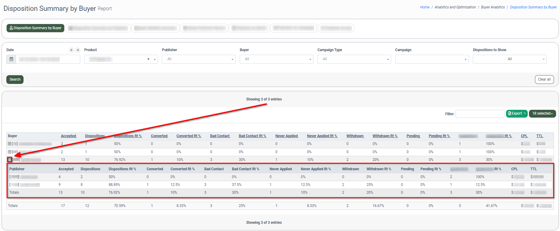 To view the summarized statistical information by each Buyer to which the corresponding Publisher has processed leads in total and with each disposition status, click the “+” button in the leftmost column of the report opposite the corresponding Publisher.