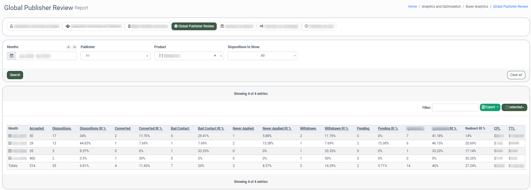 The Global Publisher Review tab allows you to view summarized information about specific or all Publishers in up to a three-month date range. The report displays information about the number of accepted leads and how many of those leads have a disposition status. Also, you can view how many of those leads were accepted by each Buyer per month. Note: This report has a date range restriction of up to three months.