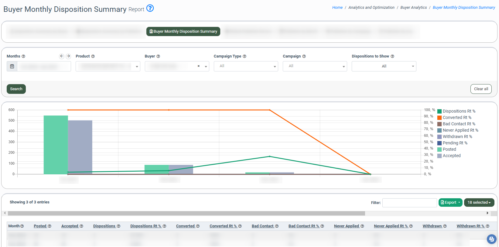 The Buyer Monthly Disposition Summary tab allows you to view monthly summarized information about the specific Buyer in the selected month range. The report allows you to view the information about the number of posted and accepted leads and how many of those leads have a disposition status. Note: This report has a date range restriction of up to three months.