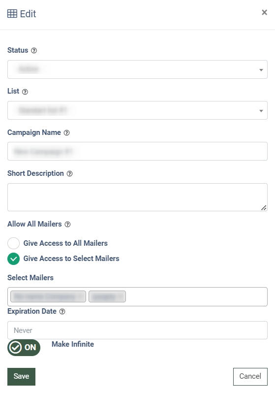 - Expiration Date (optional): Set the mailer’s access expiration date or Make Infinite.