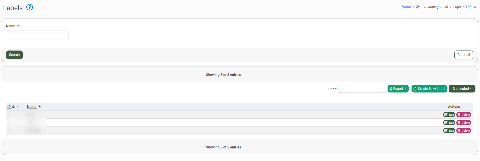 To manage the Labels for the Campaign, go to the System Management > Logs > Labels section.