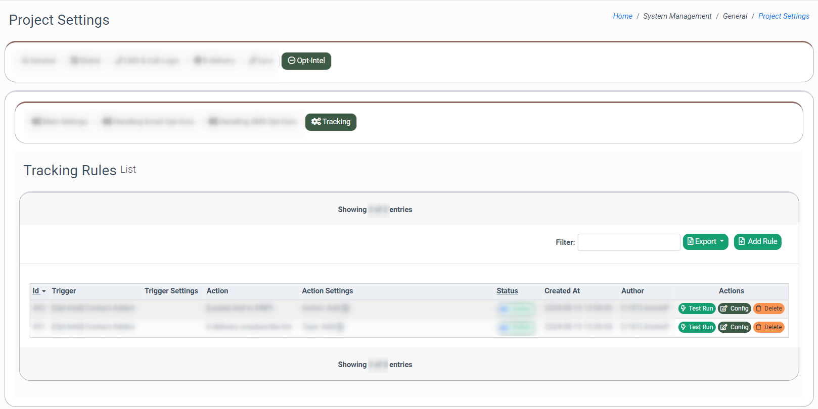 To set the Tracking Rule on the Project Settings level, go to the System Management > General > Project Settings section, select the “Opt-Intel” tab, and then go to the “Tracking” subtab.