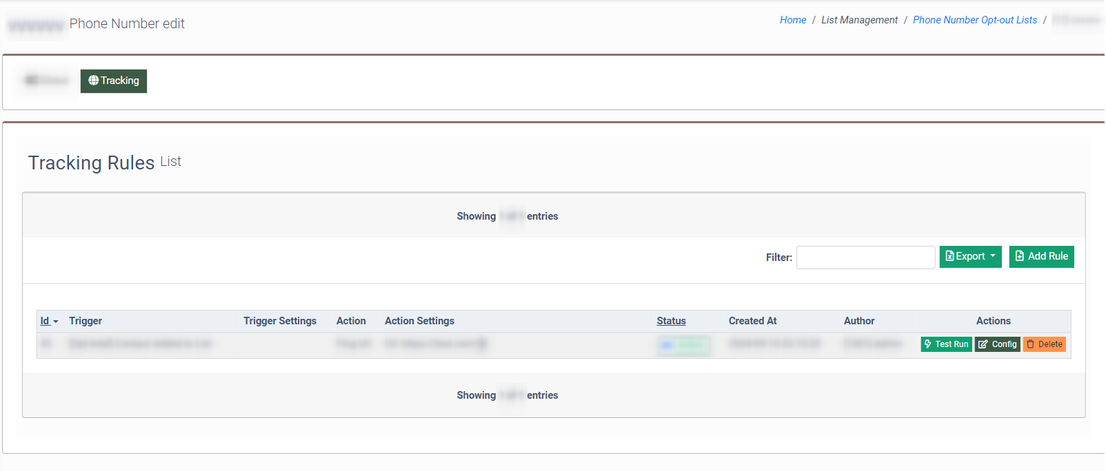 To set the Tracking Rule for the particular Phone Number Opt-Out List, go to the List Management > Phone Number Opt-Out Lists section, select the corresponding Phone Number Opt-Out List, and click the “Edit” button.