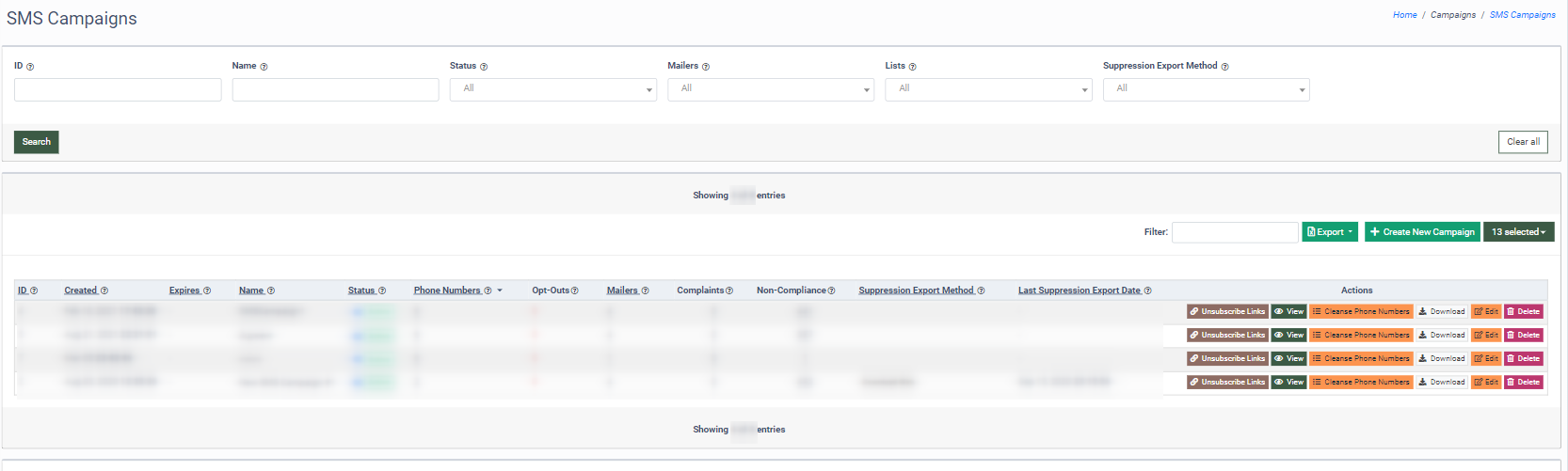To set the Tracking Rule for the particular SMS Campaign, go to the Campaigns > SMS Campaigns section, select the corresponding SMS Campaign from the list, and click the “Edit” button in the “Actions” column.