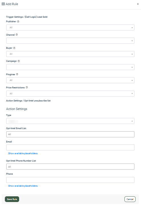 - Price Restrictions: Select the Price restrictions (Price is greater than 0, Price is greater than a certain value, Price is greater than or equal to a certain value, Price is lower than a certain value, Price is lower than or equal to a certain value, Price range inclusive). Note: The “Price range inclusive” value is available only for the “Lead Sold” and “Campaign Sold” triggers.