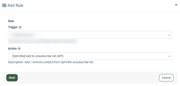 The [Opt-Intel] Add to unsubscribe list (API) tracking type allows you to add/remove an email address and/or phone number to the existing Unsubscribe (Opt-Out) List in Opt-Intel when the selected trigger event takes place.