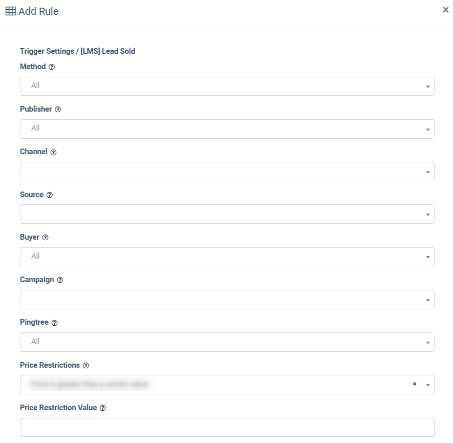 • Price Restrictions: Select the Price restrictions (Price is greater than 0, Price is greater than a certain value, Price is greater than or equal to a certain value, Price is lower than a certain value, Price is lower than or equal to a certain value, Price range inclusive). Note: The “Price range inclusive” value is available only for the “Lead Sold” and “Campaign Sold” triggers.