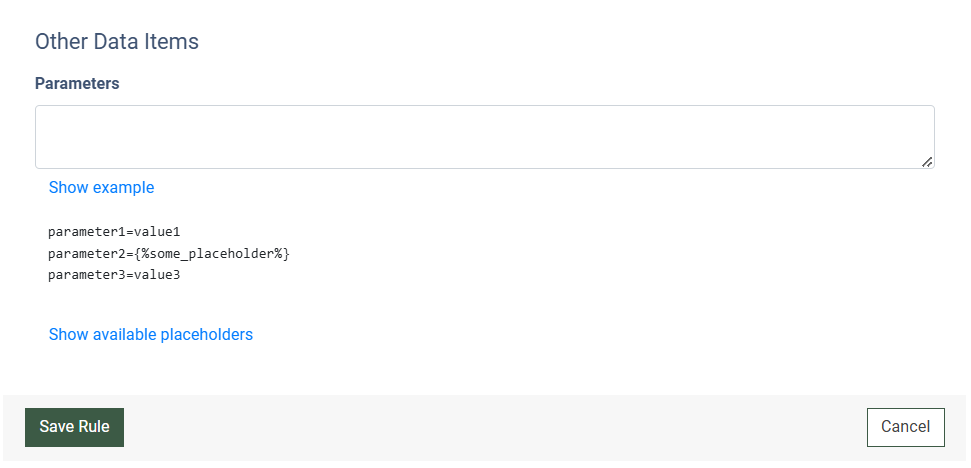 • Parameters:  Enter additional parameters if needed. To view available placeholders, click the “Show available placeholders” link. To view examples of the parameter entering format, click the “Show available placeholders” link.