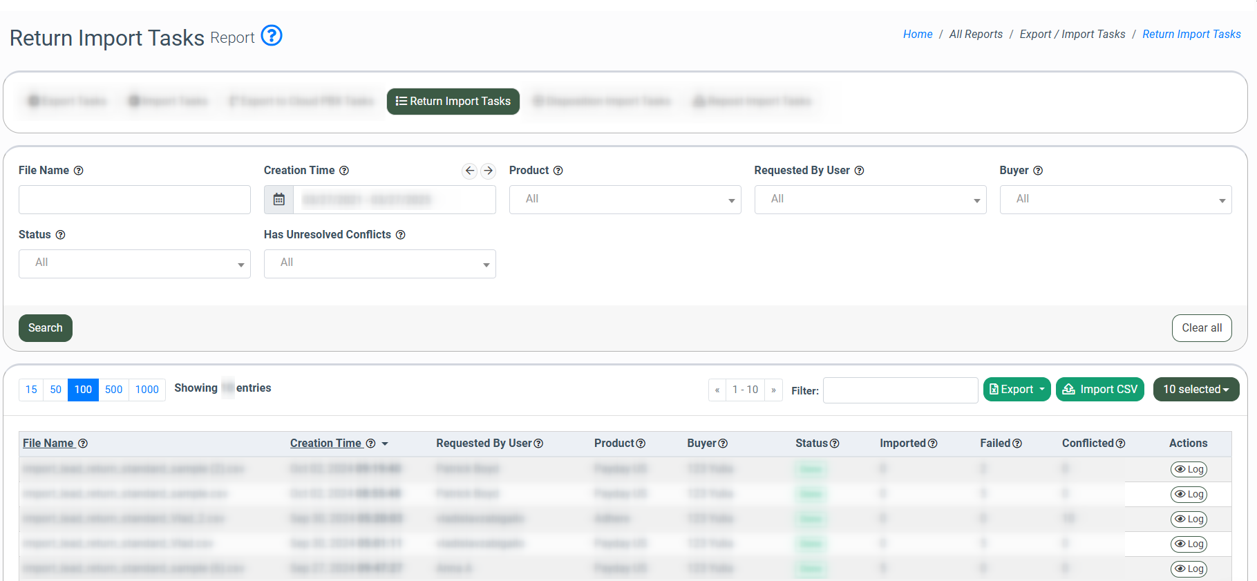 The “Disposition Import Tasks” tab allows you to import CSV files with the Leads disposition data to the system and review the status of the imported files.