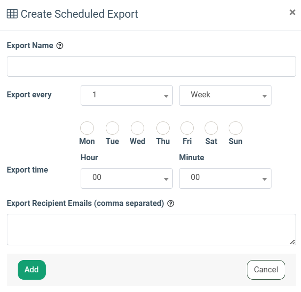 Fill in the following fields in the “Create Scheduled Export” pop-up window: