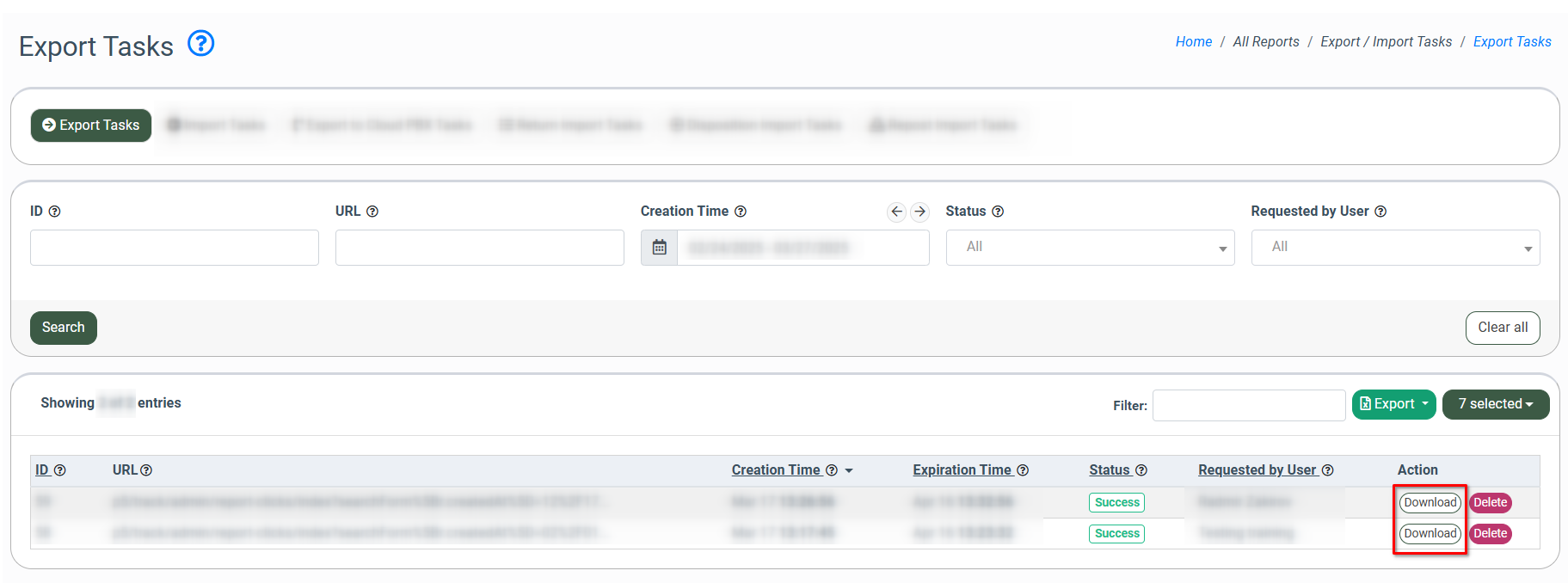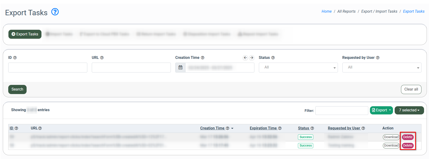 The “Export/Import Tasks” section allows you to view the list of created exports or imports and track the execution stage and status of the report export. You also have the opportunity to download the report list or delete tasks.