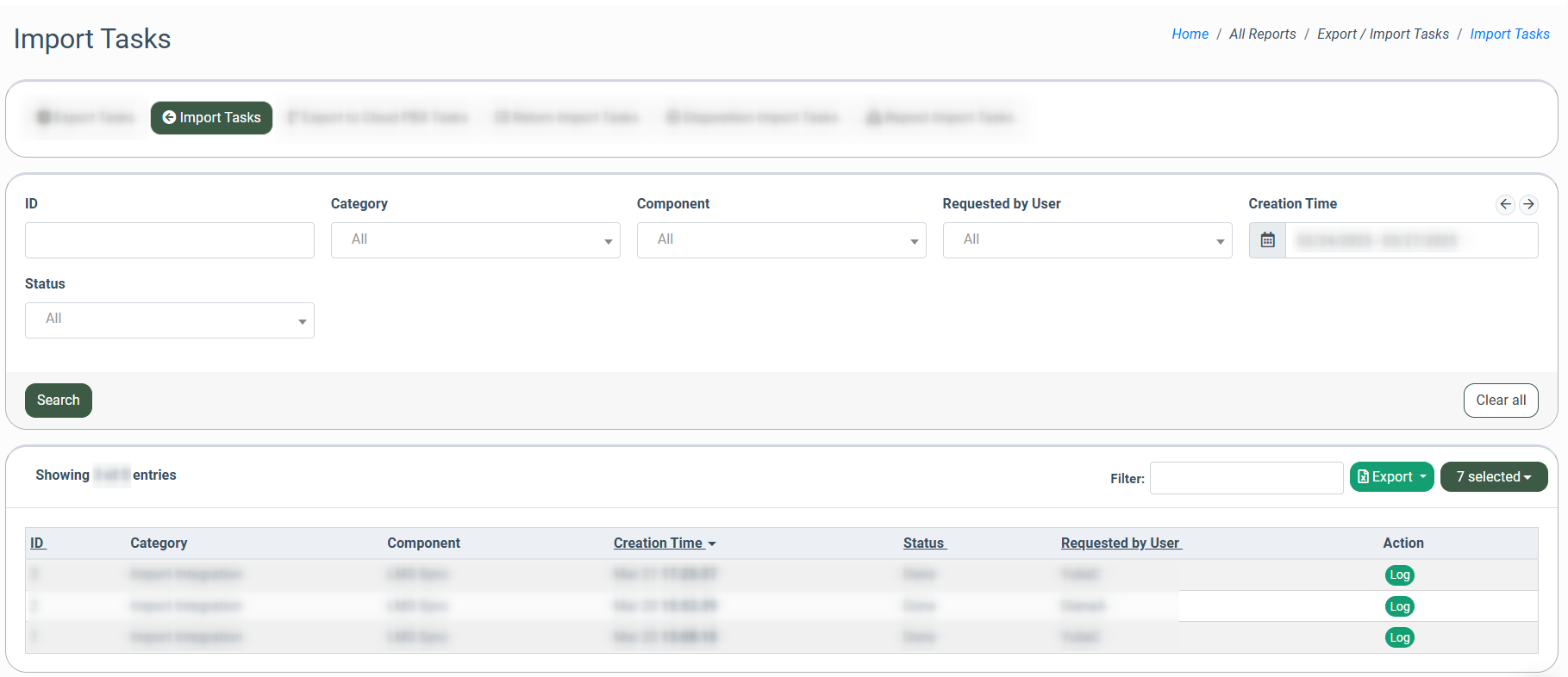 The “Export Tasks” tab allows you to view the list of exports initiated in the LMS and Call Logic components. You can download the reports table and delete export tasks.