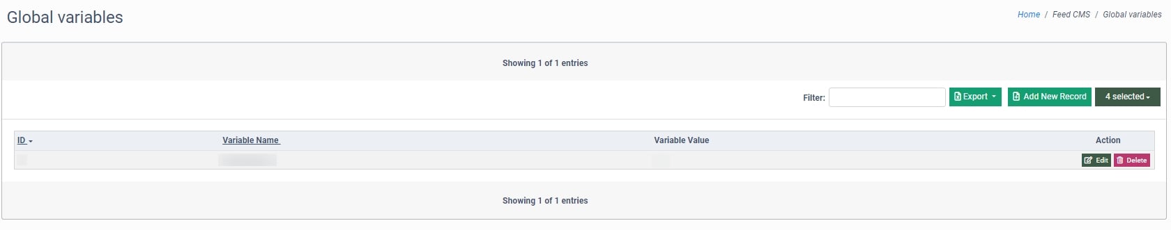 To manage the list of global variables, go to the Feed CMS > Global Variables section.