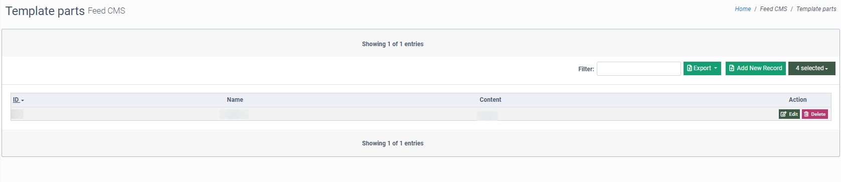 The Template Parts section allows you to add and manage the code sections that can be inserted into the feed templates to display on the websites.