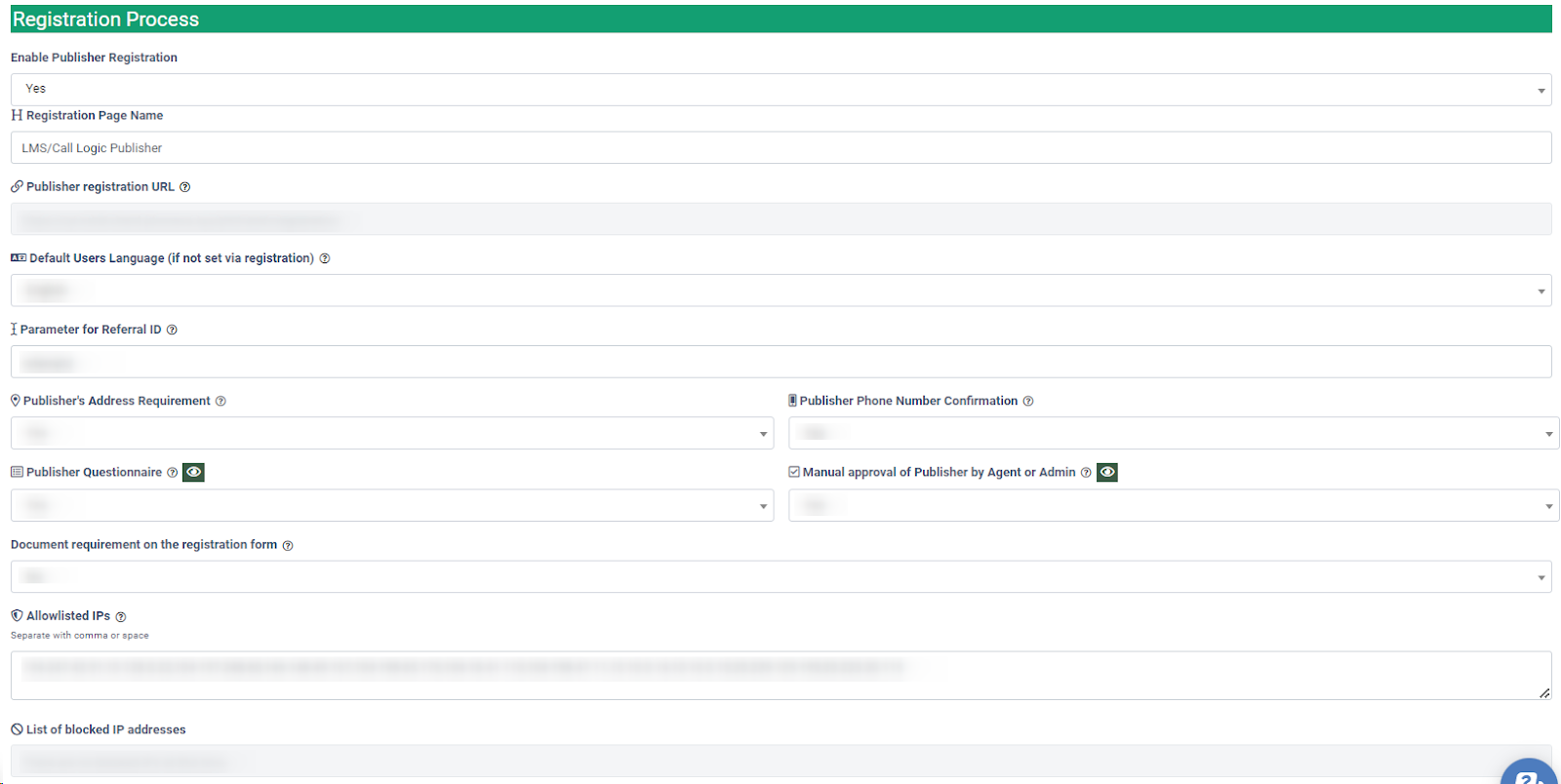 - Allowlisted IPs: Enter white-listed IP addresses for new Publisher registrations to allow registrations from those IP addresses only.