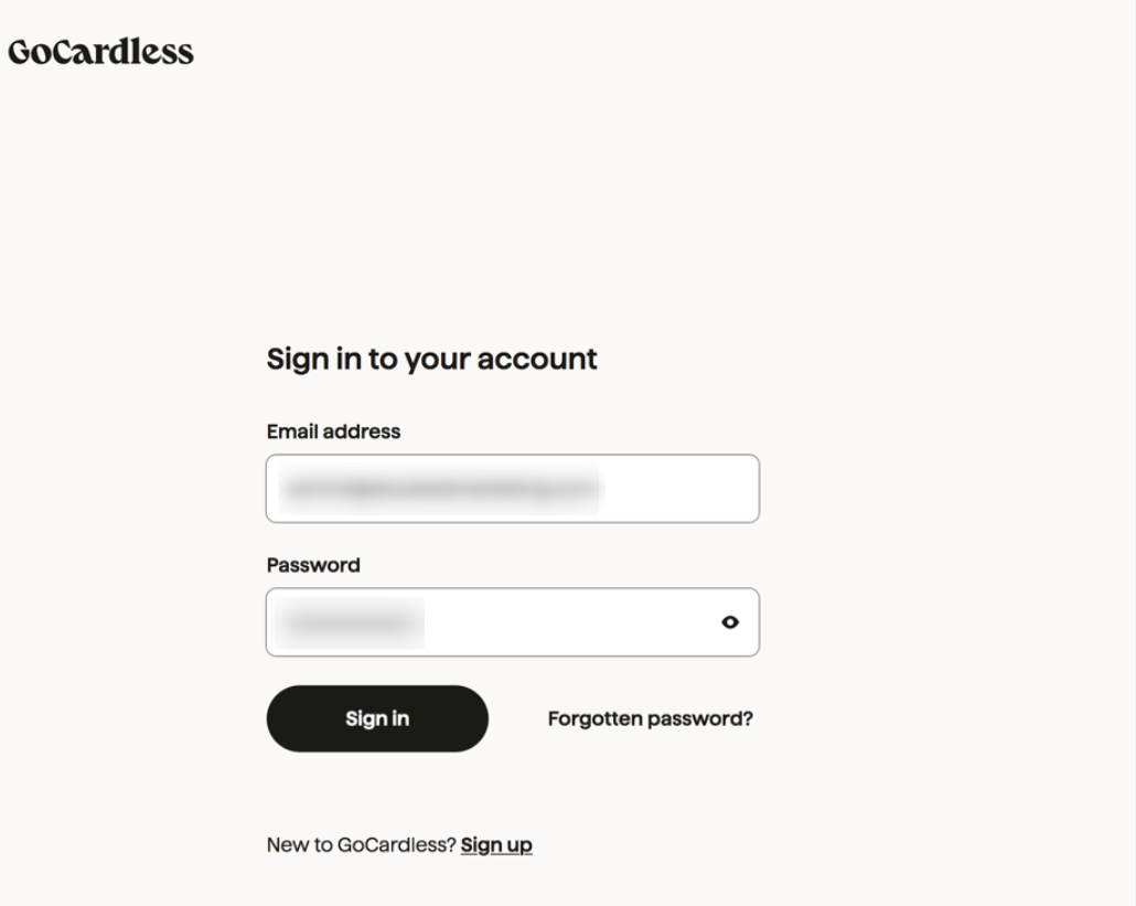 Sign in to your GoCardless account. If you do not have a GoCardless account, you must first sign up for one by following this registration link: https://manage.gocardless.com/sign-up.