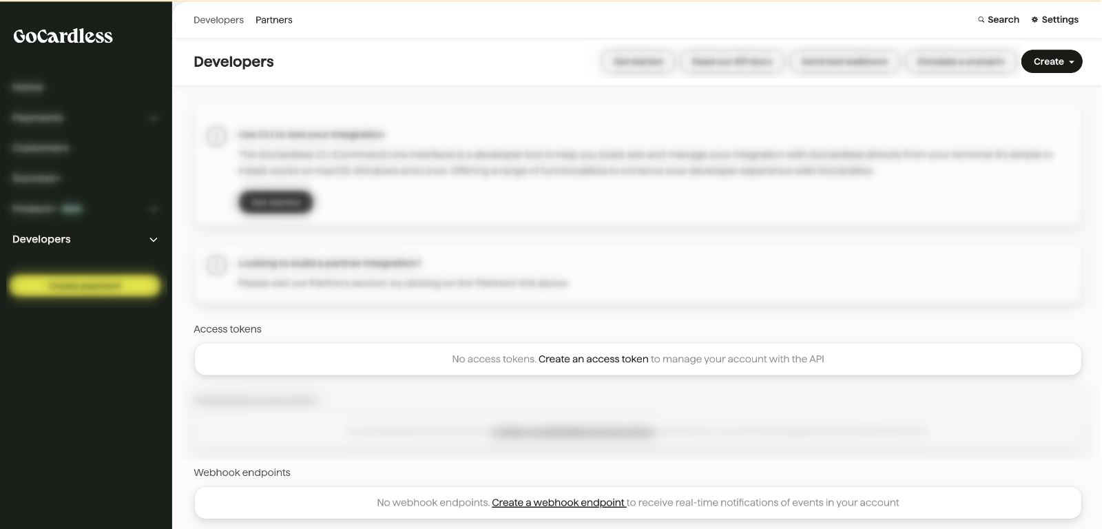 The Access Token may also be created in the “Developers” section of the GoCardless system. Go to the corresponding section and click the “Create an access token” link.
