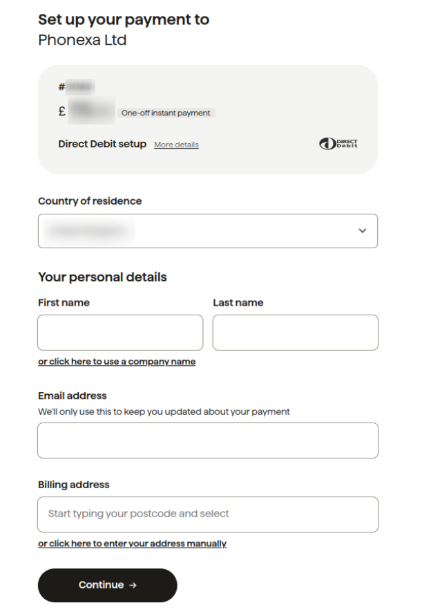 To withdraw funds via the link, follow the link included in your invoice email sent by Accounting at Phonexa and fill in the fields in the “Set up your payment to” pop-up window. Then follow the instructions from the GoCardless system.