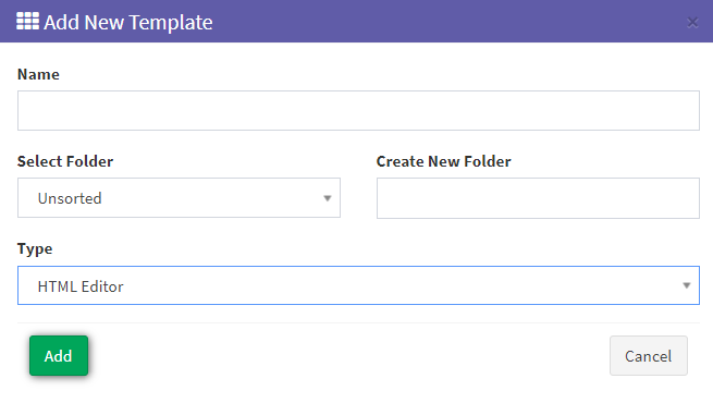 2. In the pop-up window name your email template and choose “HTML Editor” in the “Type” field. Click the “Add” button to create a new template.