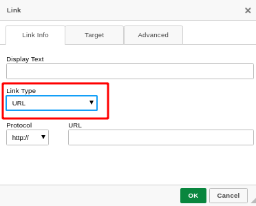 In the pop-up window fill in the “Display Text” field and select the “Unsubscribe link” in the “Link Type” field. Click the “OK” button to save.