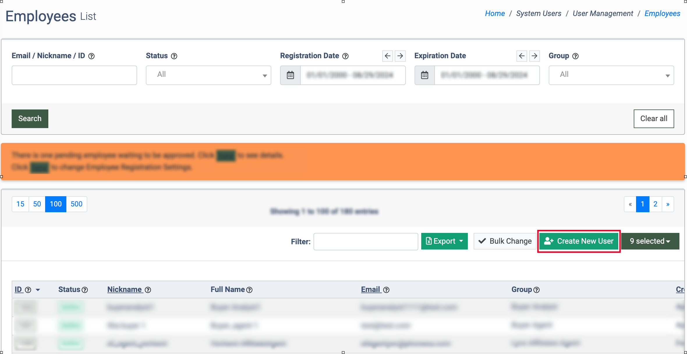 1. First, let’s view how to create an account with a Sr. Buyer Agent system role. To do so, go to the System Users > Employees section. Click the “Create New User” button.
