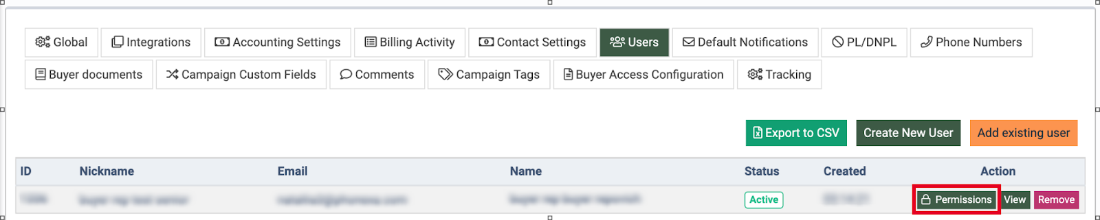 Once the user is created, click the “Permissions” button in the “Action” column.