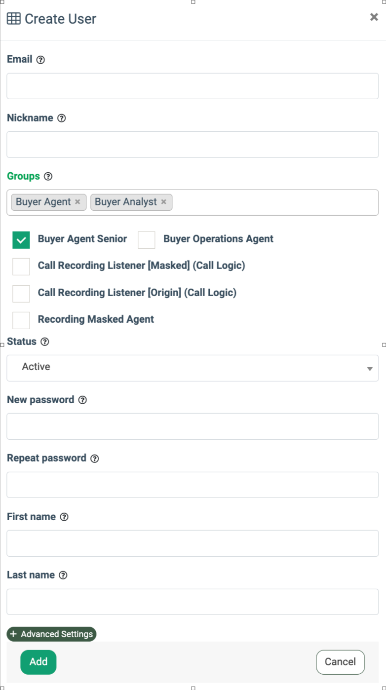 - Groups: Select the “Buyer Agent” and “Buyer Analyst” groups and then check the "Buyer Agent Senior" checkbox.