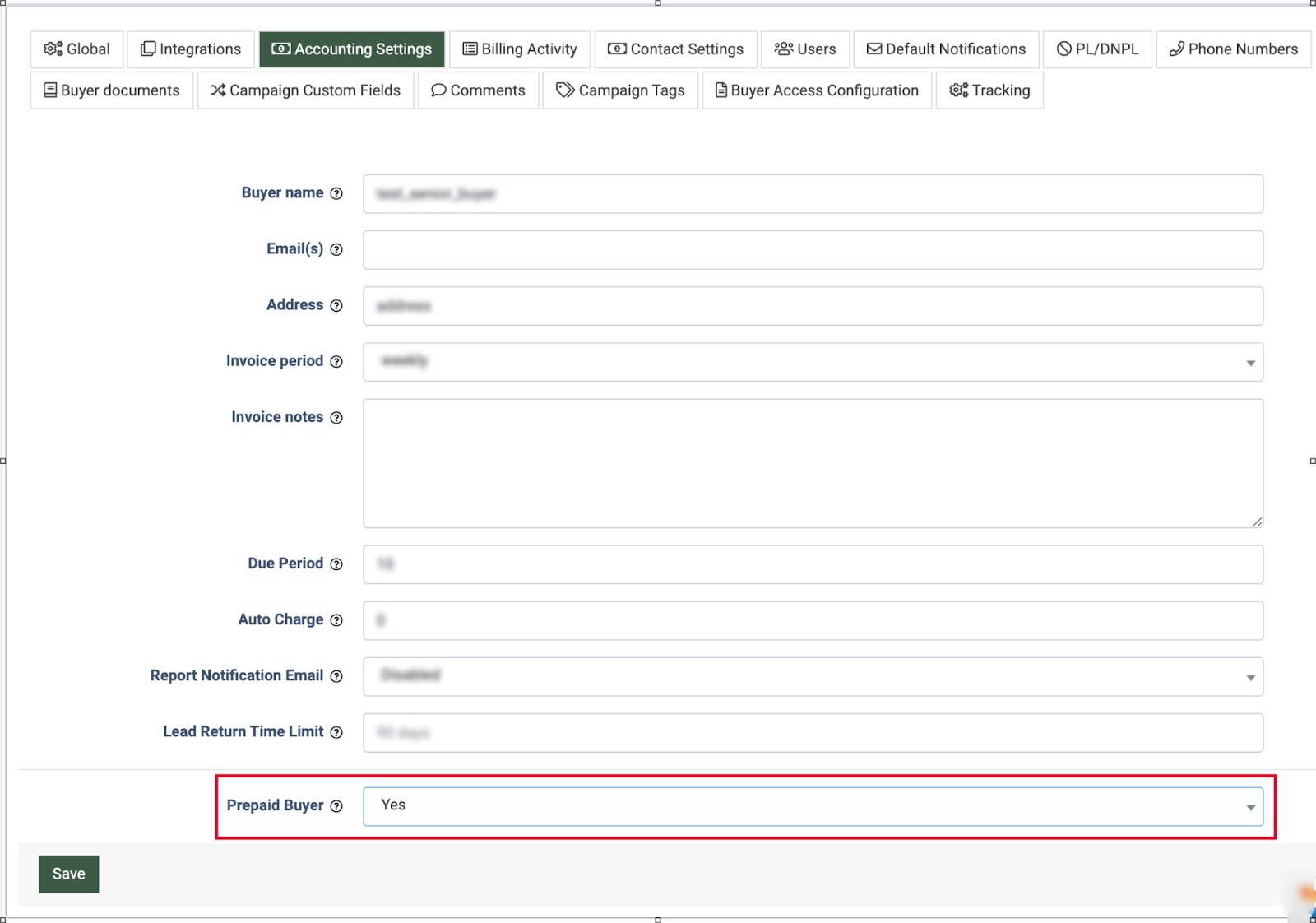 3. To enable the Prepaid Buyer Option for this particular Buyer, go to the “Accounting Settings” tab and select the “Yes” option in the “Prepaid Buyer” field. Then click the “Save” button. You can read more about the Prepaid Buyer feature in this Knowledge Base article.