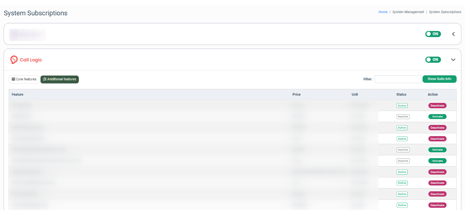 To turn off the feature, go to the System Management > System Subscription section and click the “Additional features” button. Click the “View/Edit” button in the Action column and click the “Deactivate” button.