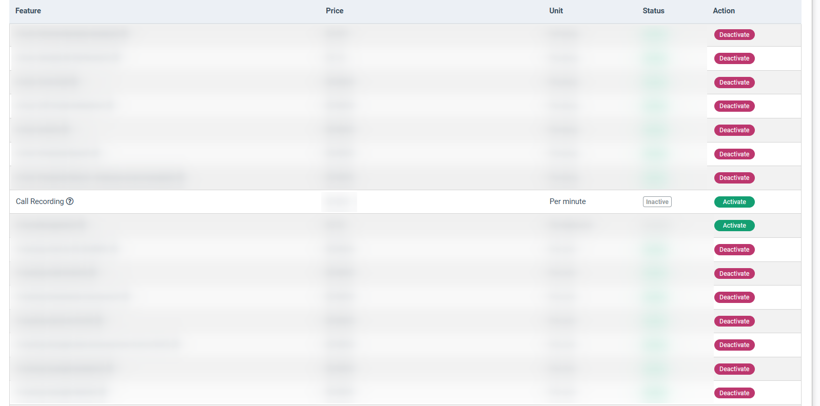 In the list of additional features, find the “Call Recording” option and click the “Activate” button.