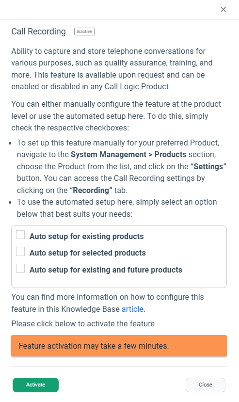 - Auto setup for existing products: Sets the “Record X percent of total calls” to 100 for all active Products in the Product Setup section.
