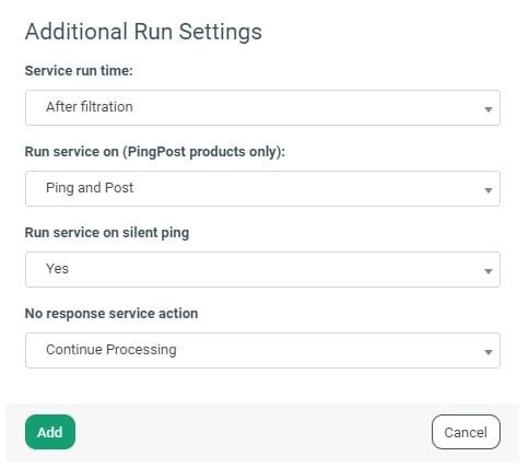 • Run service on (PingPost products only): Select one of the options to determine at which stage you prefer to run the service for the Ping Post products (Ping / Post / Ping and Post).