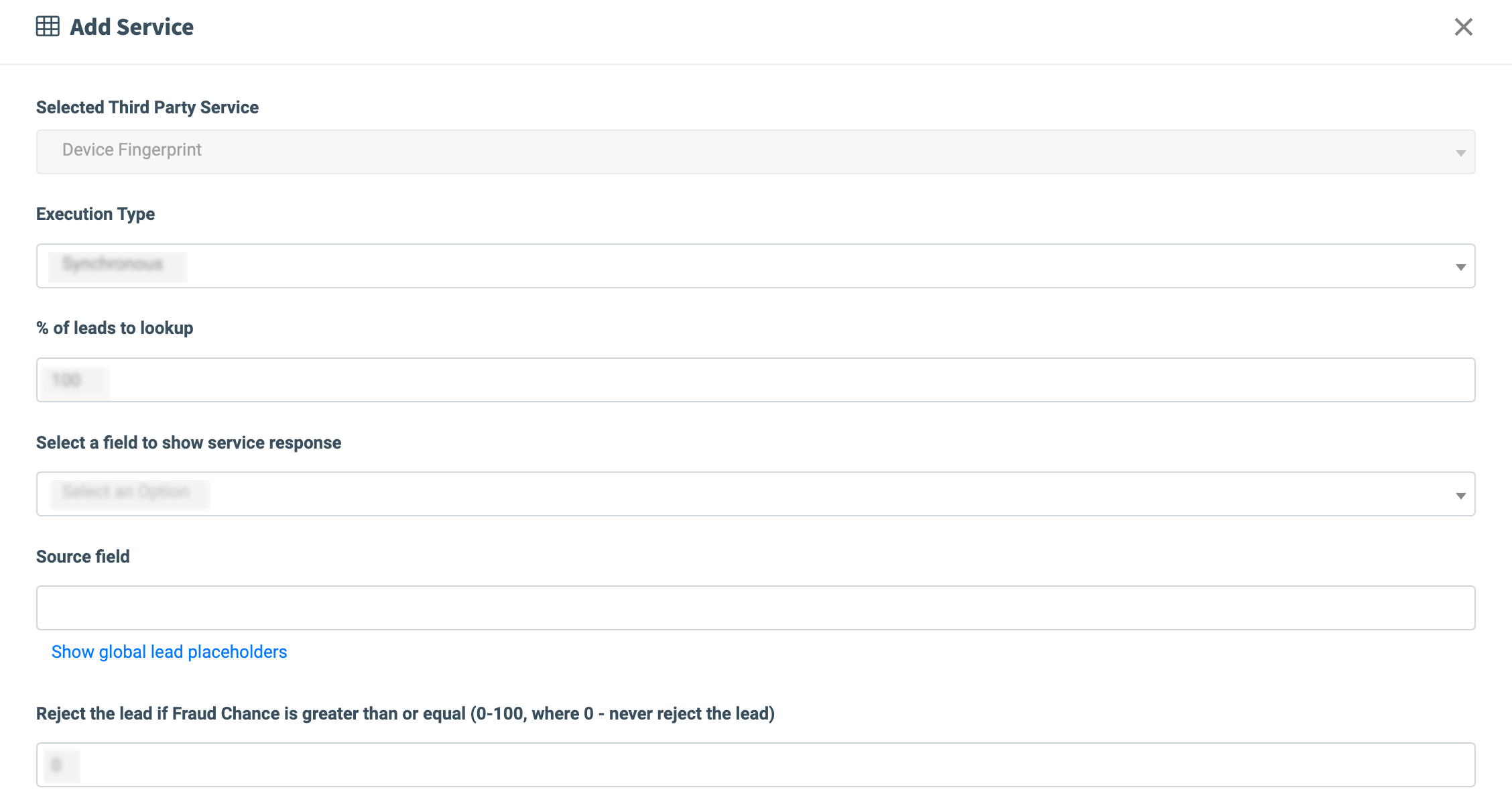 - No Response Service Action: Select the action in case of no response from the third-party service (Continue Processing, Reject the Lead).