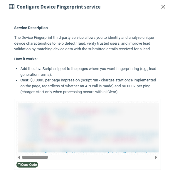 For this service to work, you need to copy and paste the provided JavaScript code onto the pages where you want fingerprinting to run (e.g., lead generation forms). Note: There is a default cost per page impression once the script runs (charges start once it is implemented on the page, regardless of whether an API call is made). For the service itself, the price is per ping (charges apply only when processing occurs within iClear).