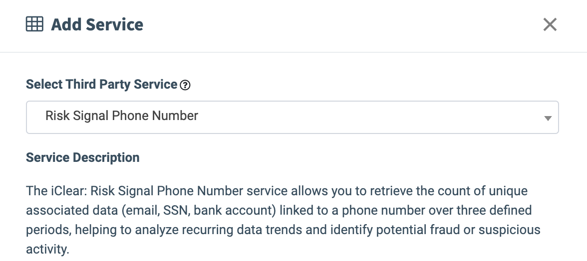 - Select Third Party Service: Select the “Fraud Signal Phone Number” option, and click the “Add to iClear” button.