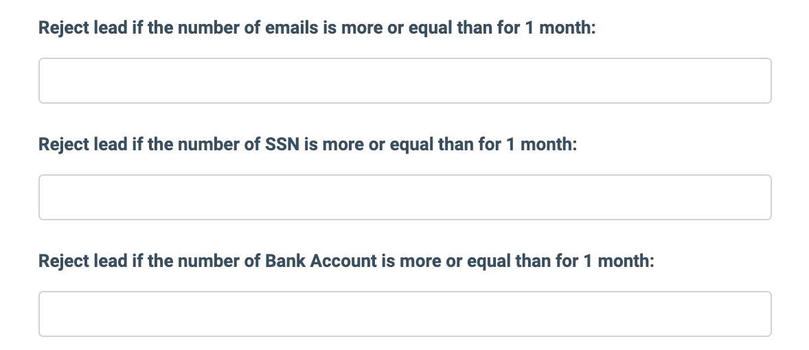 - Reject lead if the number of SSNs in 1 month/3 months/1 year is greater than or equal to: Enter the maximum number of SSNs associated with the phone number for the lead to be rejected.