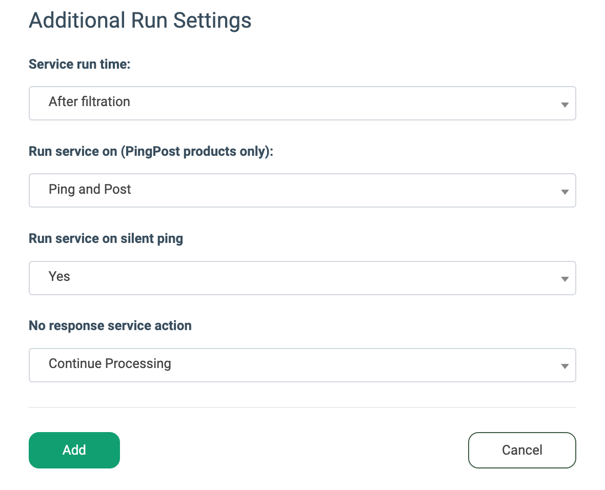 Note: Please be aware that selecting this option may impact your invoice. Once this option is selected and no campaigns remain for the service to run, there will be no charges incurred. - Run service on (PingPost products only): Select one of the options to determine at which stage you would prefer to run the service for the PingPost products (Ping / Post / Ping and Post).