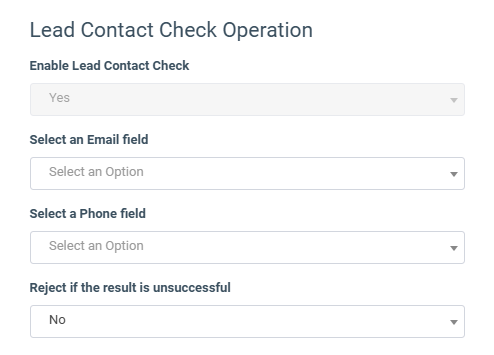 The “Lead Contact Check Operation” allows you to check the lead’s email and/or phone number against the information captured on the lead recording.