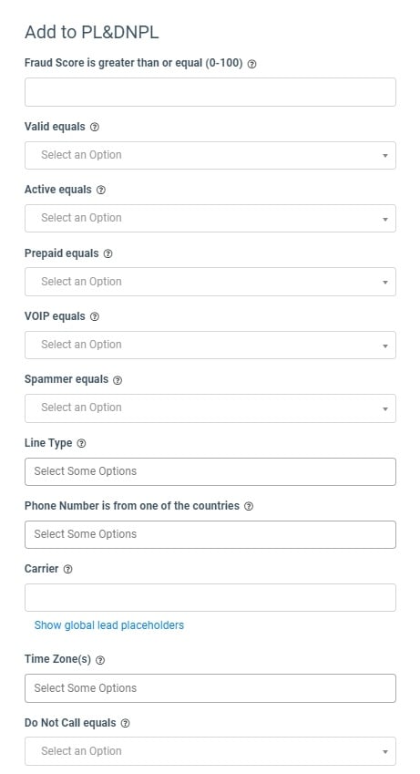 - Reject lead if Active Status equal to: Select statuses for the phone number to be rejected (Active Line, Active Line - High Confidence, Active Line - Medium Confidence, Active Line - Low Confidence, Disconnected Line, Phone Turned Off, Inconclusive Status, N/A).
