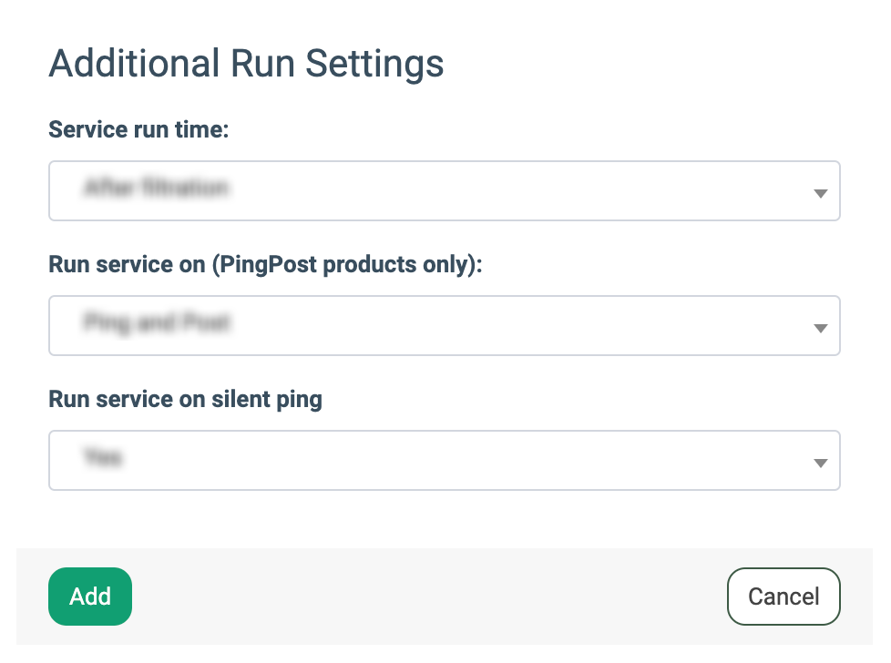 • Run service on (PingPost products only): Select one of the options to determine at which stage you prefer to run the service for the Ping Post products (Ping / Post / Ping and Post).