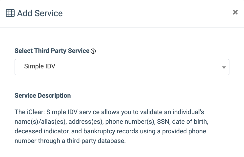 The iClear: Simple IDV service allows you to validate an individual’s name(s)/alias(es), address(es), phone number(s), SSN, date of birth, deceased indicator, and bankruptcy records using a provided phone number through a third-party database.
