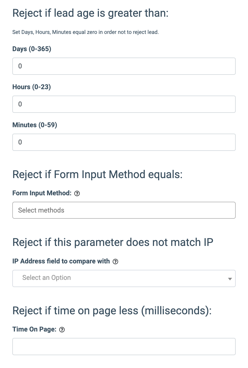 • Reject if lead age is greater than: (available only if Synchronous or On-Demand execution type option selectedFill in the most allowed time for the lead to be on the landing page and fill the form (Set Days, Hours, and Minutes equal zero in order not to reject leads).