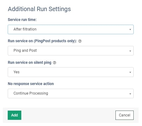 • Run service on (PingPost products only): Select one of the options to determine at which stage you would prefer to run the service for the Ping Post products (Ping / Post / Ping and Post).