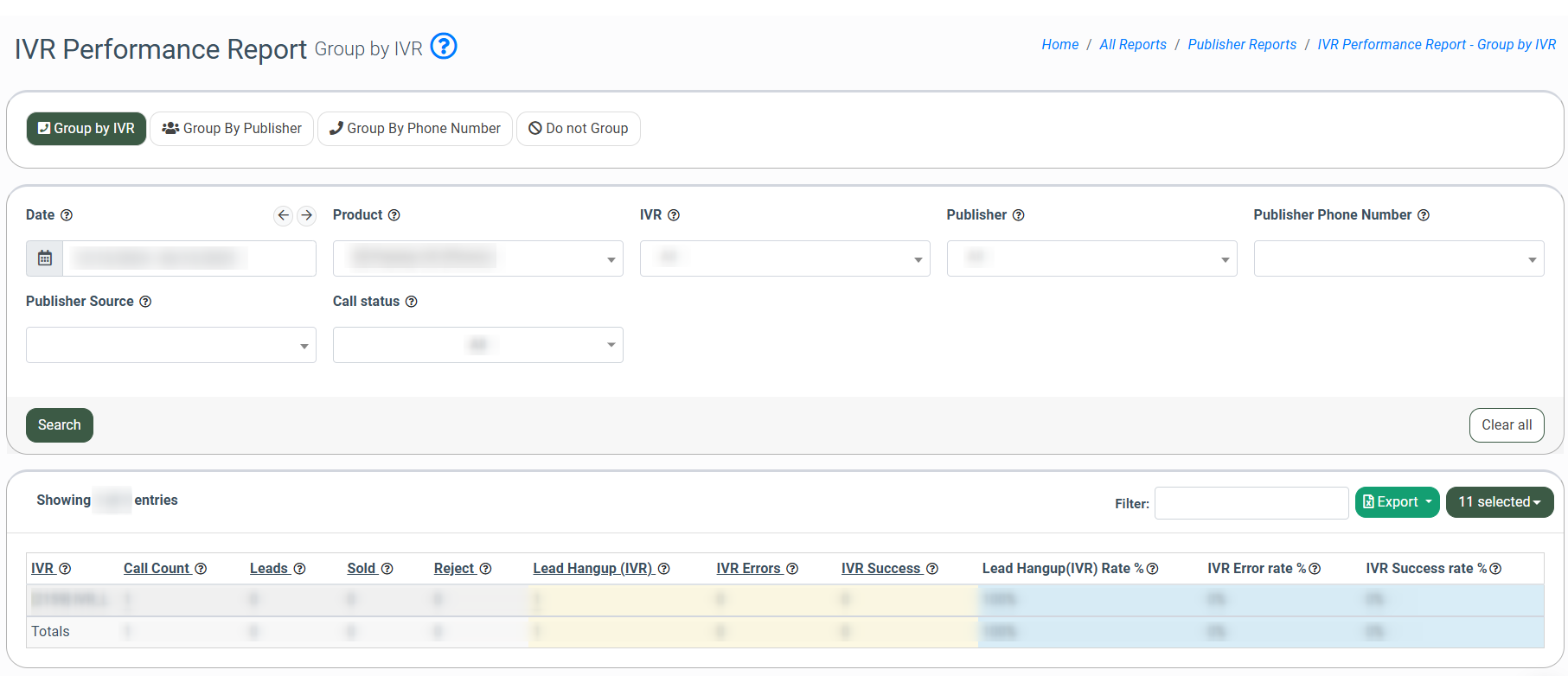 You can review the report grouped by IVR, Publisher, and Phone Number.