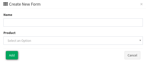 To create a new JS form, click the “Create New Form” button, enter the name for the new form in the Name field, and select the Product and Template for the new form in the “Create New Form” pop-up window.